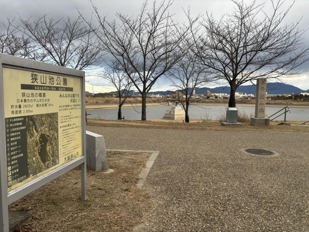 池之原神社から歩くこと10分程度で狭山池の西側に出ます。
