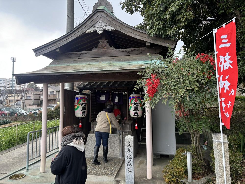 神社の入り口にある文殊地蔵尊にも参拝者がいました。