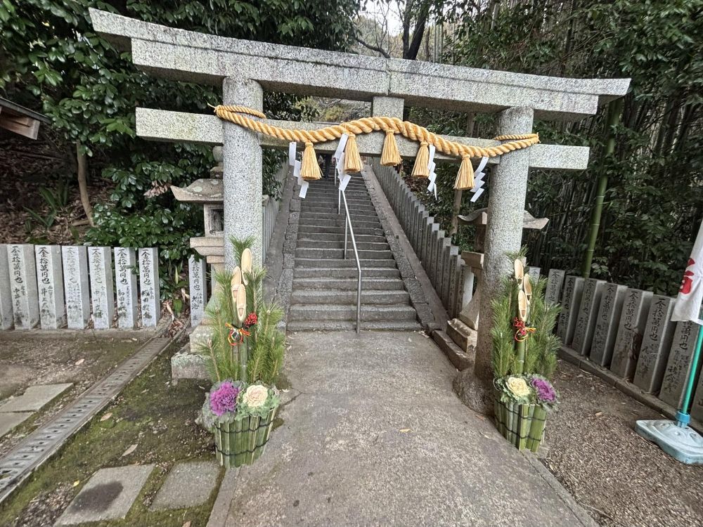 途中に鳥居があり、左右に門松があります。