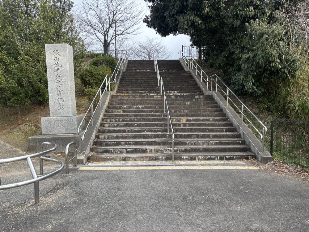 平成の大改修を記念した石碑の横の階段を上がって狭山池に向かいます。