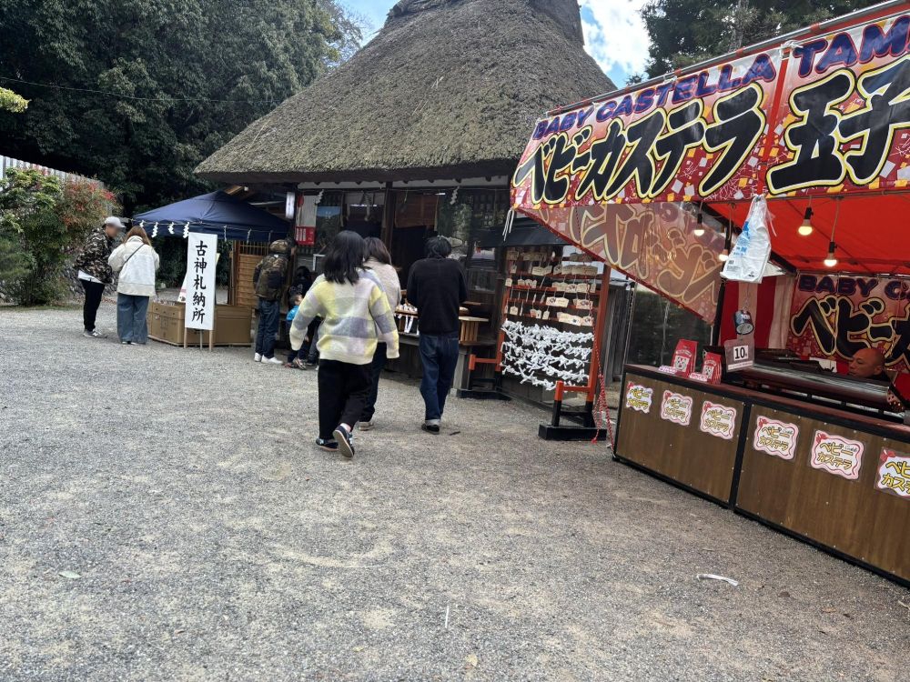 茅葺屋根になっているところが古神札納所です。ベビーカステラの屋台も出ていました。