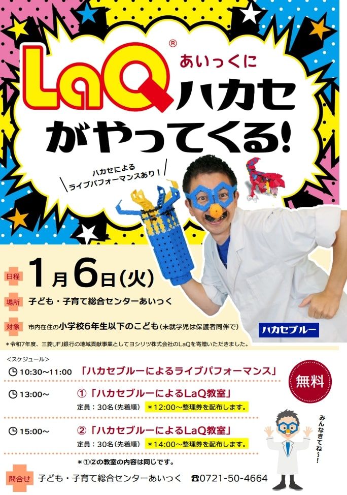 1月6日に駅前ノバティながの北館5階にある子ども・子育て総合センターあいっくに、LaQハカセがやってきます。これは河内長野市内在住の小学校6年生以下の子どもを対象としたイベントで、ハカセブルーによるライブパフォーマンスとLaQ教室(13:00、15:00同じ内容で整理券配布)が行われます。なお未就学児が参加する場合は保護者同伴でお願いしたいとのこと。