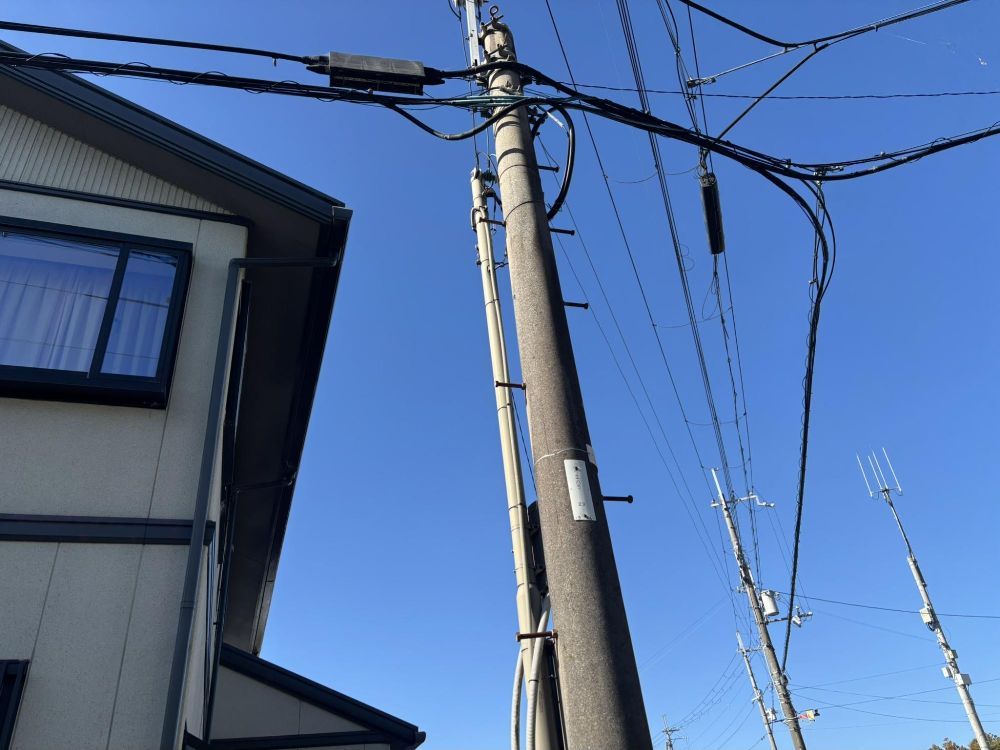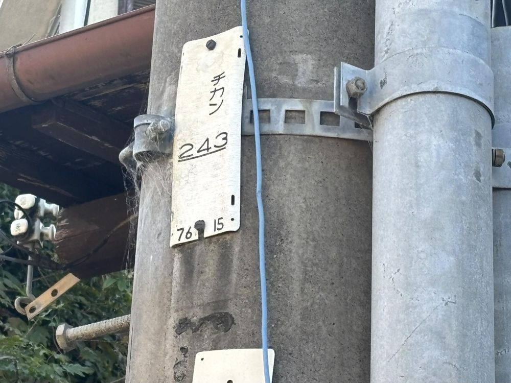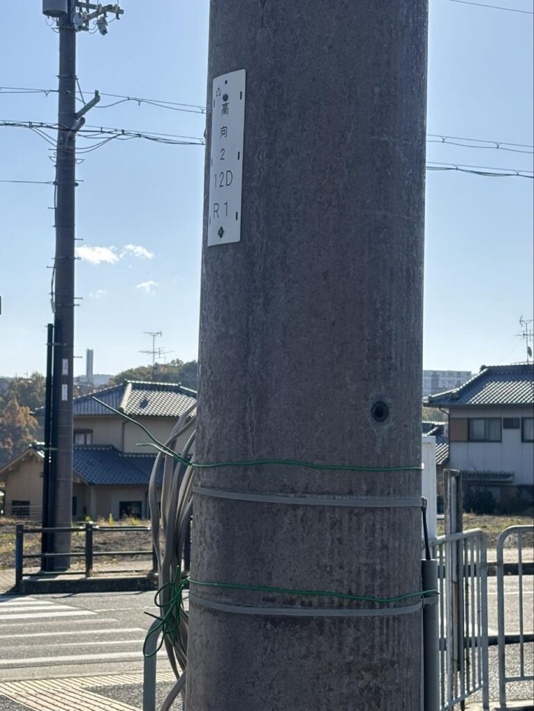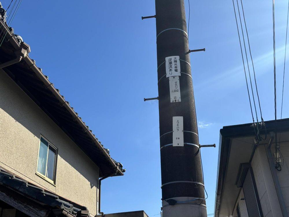 こちらの電柱には「太陽光発電逆潮流あり」と書いてあります。通常は電気を家庭に供給(潮流)が起きていますが、太陽光発電をしている場合、太陽光の発電量が自家消費電力量を上回ってしまう場合があります。そうすると、自動的に余剰電力が送電網へ流れる(逆潮流)が起こるそうです。