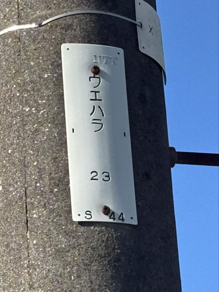 柱には「ウエハラ」と書いてあり、そのうえにNTTが見えます。上原は地元では「ウワハラ」と呼んでいますが、電信柱の名前としては「ウエハラ」のようです。