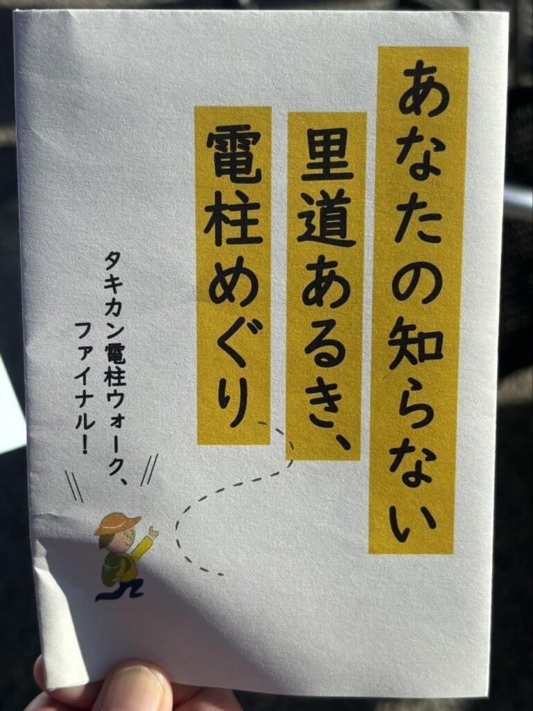 少し前になりますが、11月に滝畑ふるさと文化財の森センター主催で「タキカン」電柱を歩くイベントが行われました。電柱を追いかけながらのウォーキングというのはなかなか面白く、新しい散歩の楽しみ方ということで、その様子を紹介したいと思います。