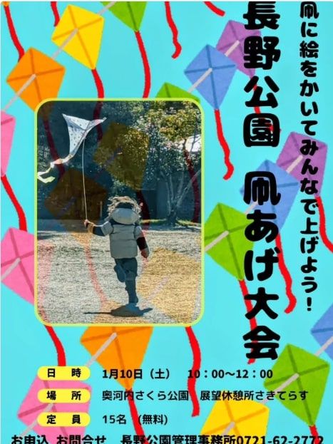 お正月、狭山池を歩いていると凧を揚げている姿を見ました。同様に河内長野駅近くにある、大阪府営長野公園「凧あげ大会」でも開催します。これは長野公園の最初のイベントです。