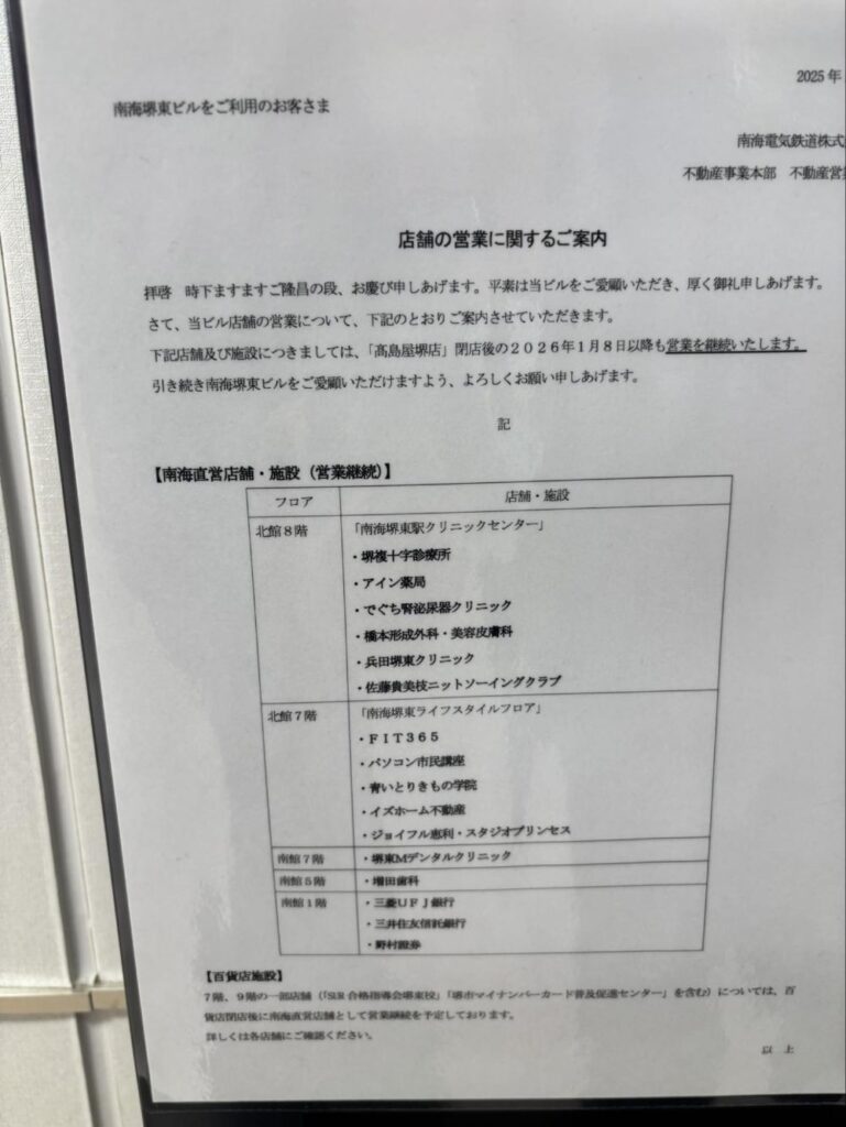 そして建物の賃貸借契約の満了というタイミングで閉店に踏み切ったというわけです。ということで、私は営業最終日に堺東駅に行き、堺タカシマヤ最終日の様子を見てきました。
