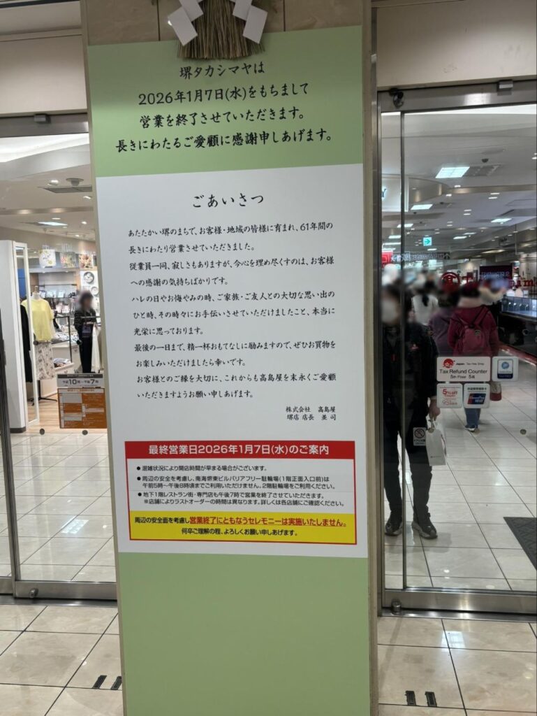 すでに様々なメディアで紹介されているのでご存じの方も多いと思いますが、堺東駅にある堺タカシマヤが1月7日で営業が終了しました。