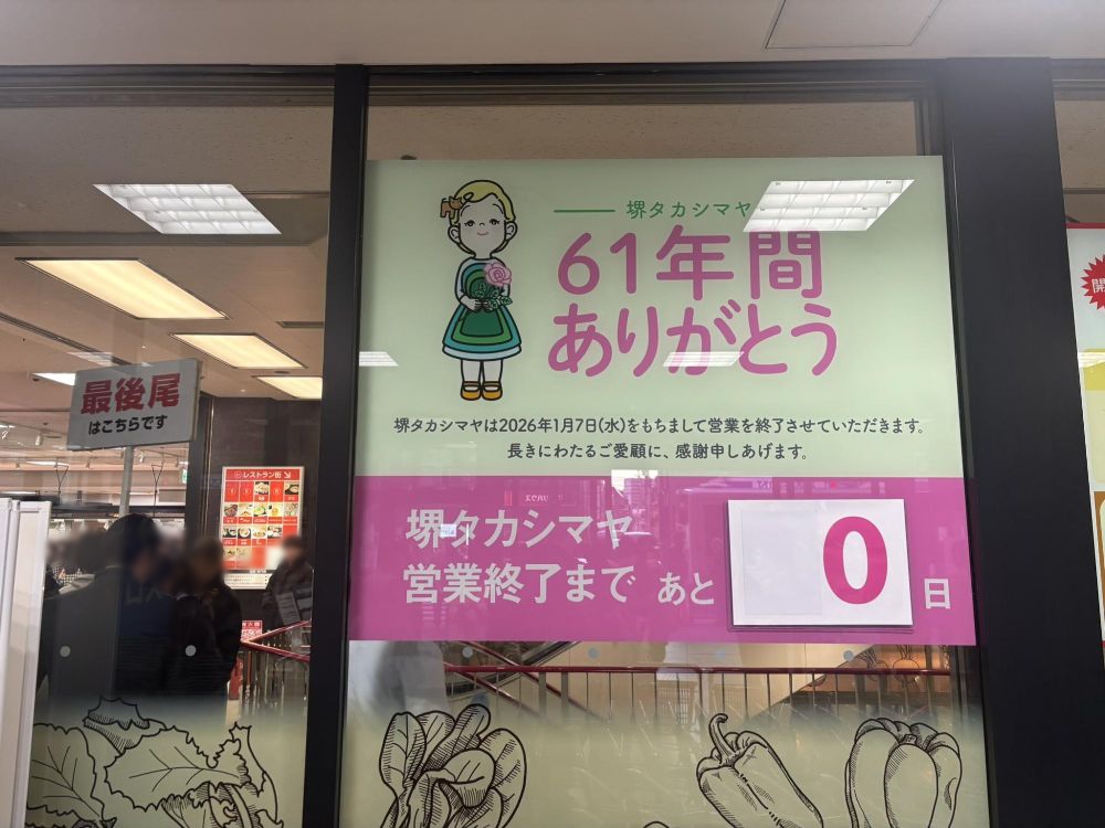 このほか、各フロアではスーツ姿の人が各店舗の店員さんと記念撮影をするなど、最終日の雰囲気に満ちていました。食料品売り場では最後とばかりに、最後尾のプラカードがでるなど、とてつもない賑わいをみせていた堺タカシマヤの最終日を確認しました。