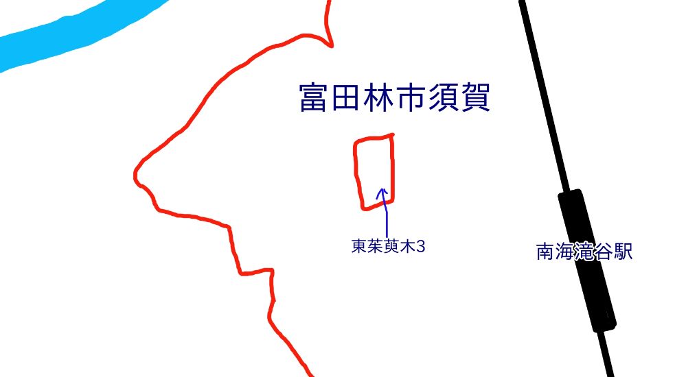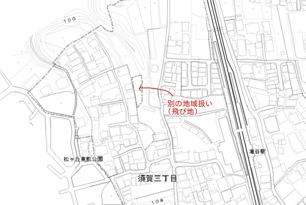 その飛地はこちらです。南海滝谷駅の西側、須賀地域の中に「東茱萸木(ひがしくみのき)3」という表記の場所があります。ちょうど緑色で囲まれたところですね。