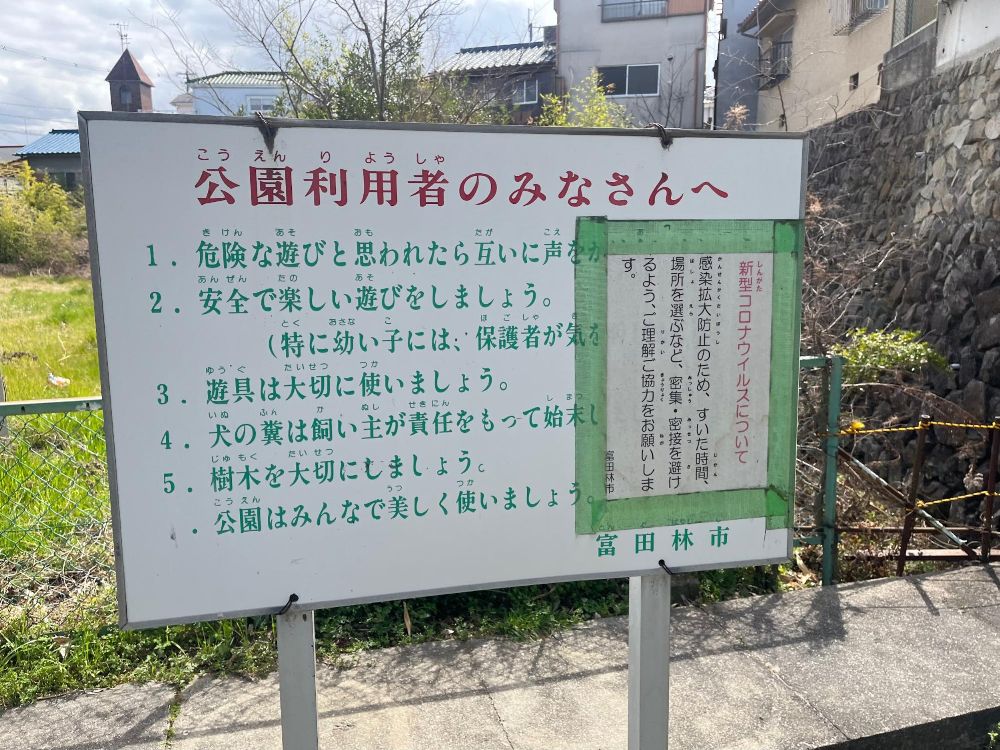 公園利用者の注意書きです。これを見ると、なぜか富田林市となっています。ということは、実際には大阪狭山市の飛び地ではないという意味なのでしょうか。もしくはかつては飛び地だったものが、今は富田林市内に編入されたのでしょうか。