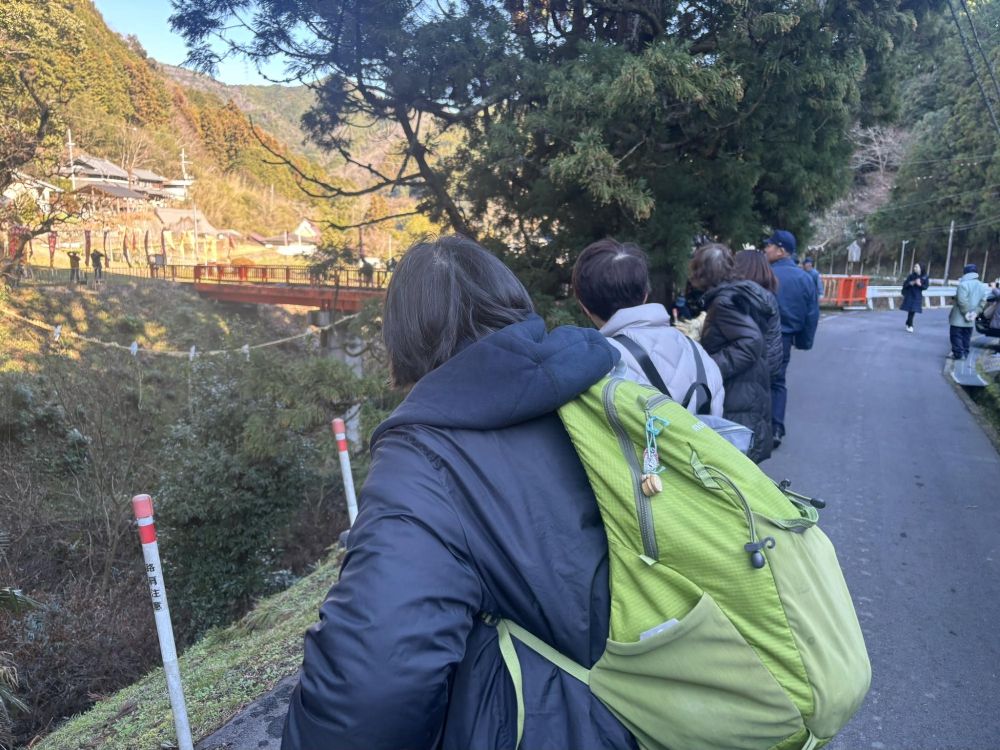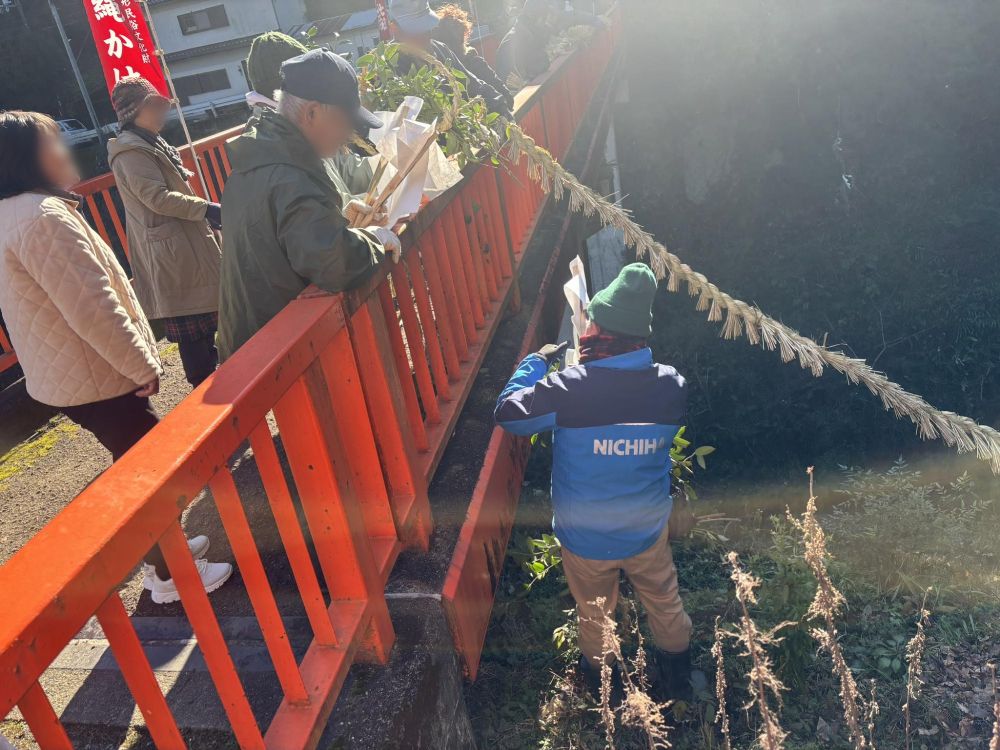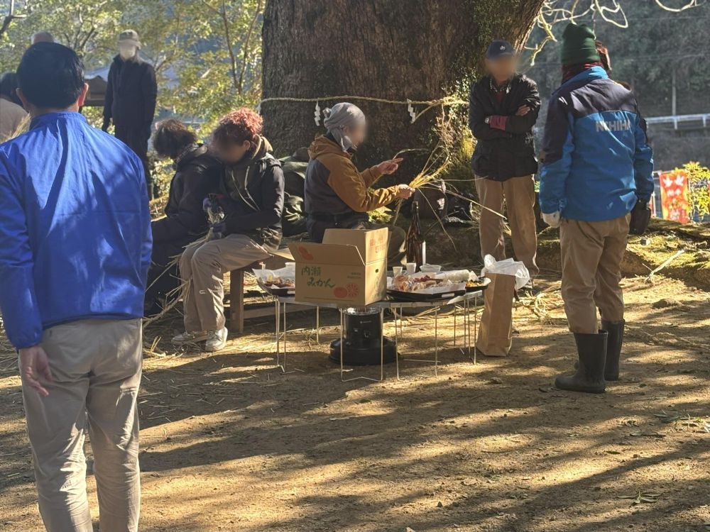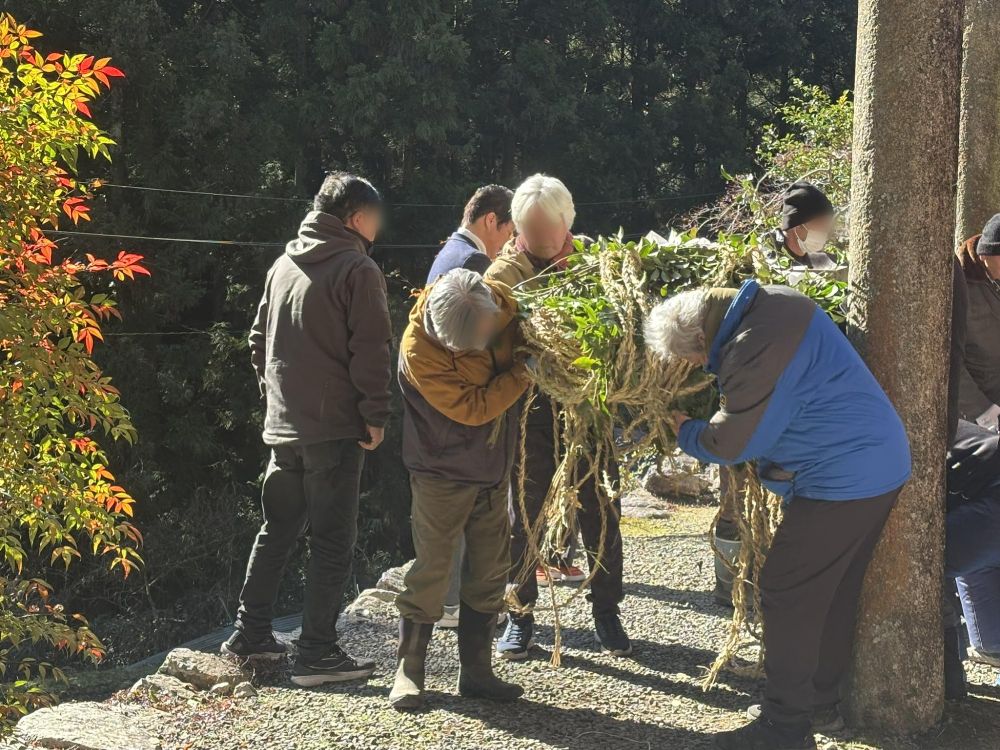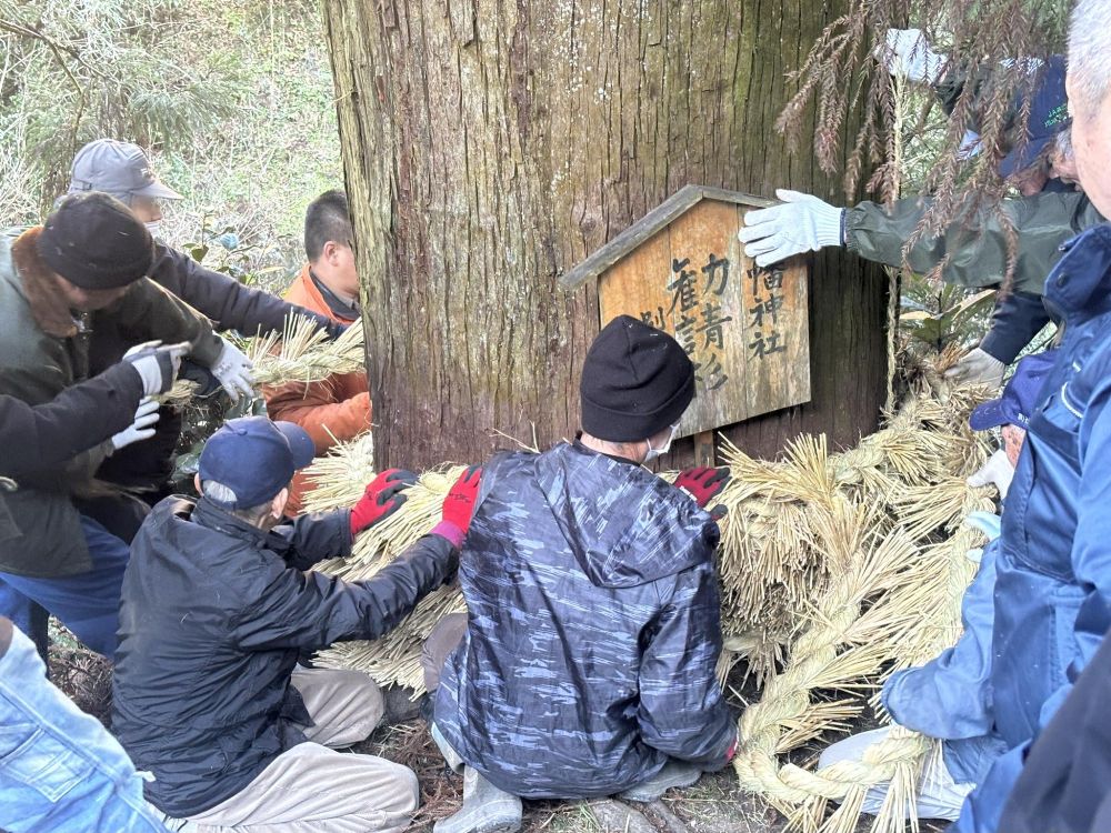 やることは縄を勧請杉に括りつける際に、何度も縄を延ばすために縄をもっていったりきたりする単純な作業ですが、少しでも伝統神事のお手伝いができると、とても嬉しいものです。