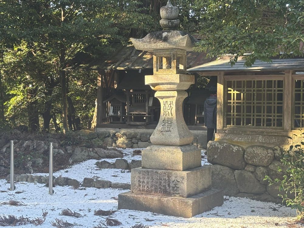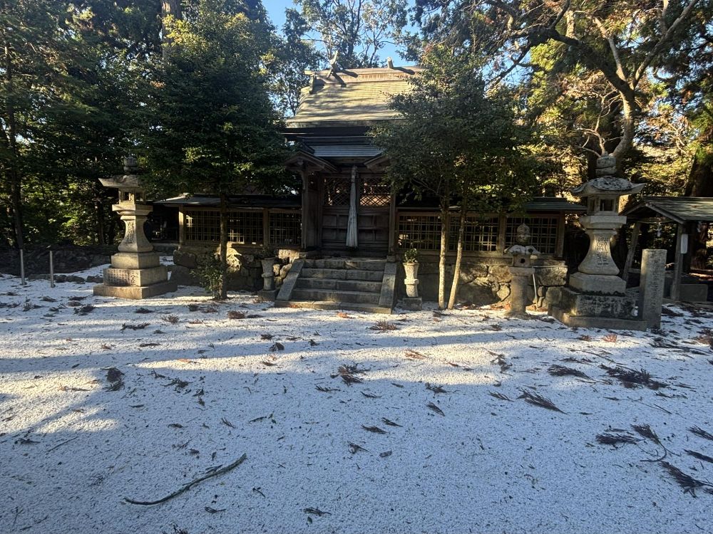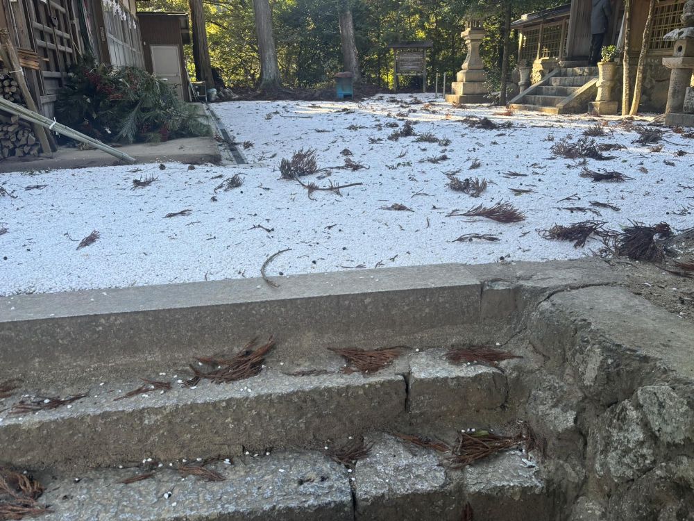 神社の境内まで上がると、本当に驚きました。白い玉砂利で覆われた境内はまるで雪が積もった雪景色のようになっていたからです。