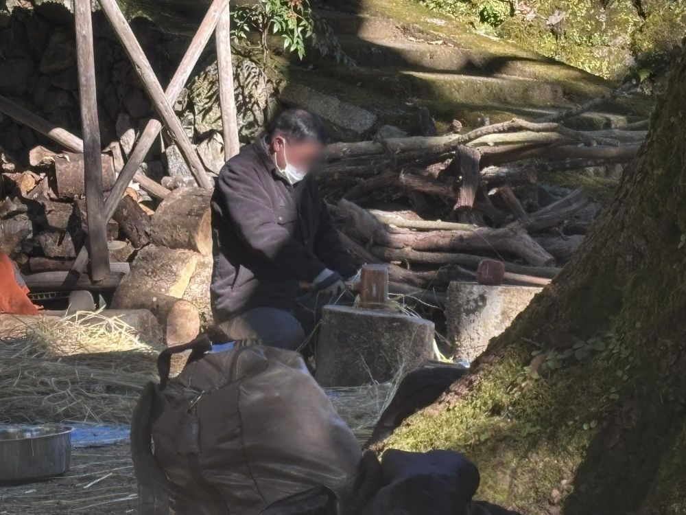 藁(わら)を縄にするために木のトンカチでたたいている人や