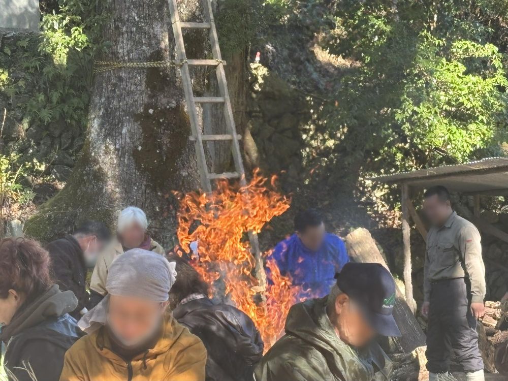 昨日は天気も良く少し暖かったのですが、それでも真ん中のたき火が燃え上がり、その温かい空気をバックに作業が進められていきます。