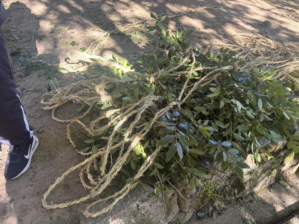 年により差はあると思いますが、例年夏ごろまで縄が切れずにつながっています。この後紹介する蝋梅(ろうばい)見学に行くついでなどで、新しい縄がかけられた様子を眺めてみてはいかがでしょう。