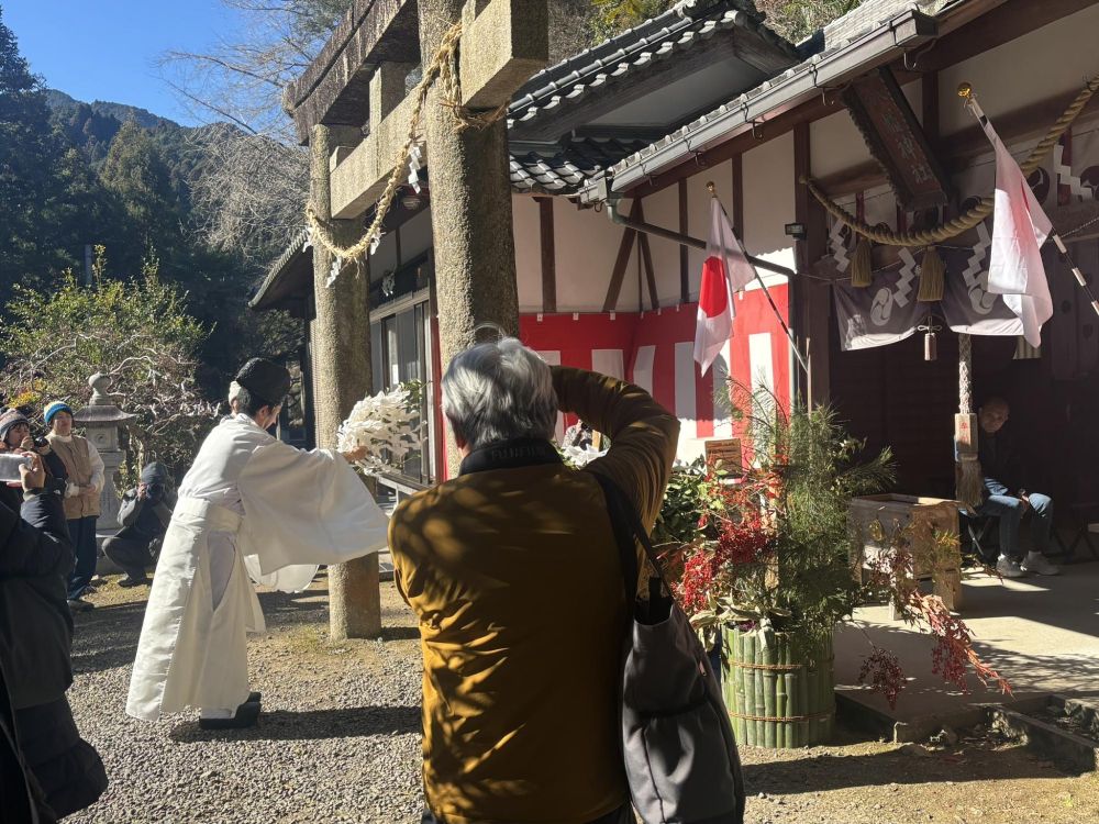 そして最後に、縄がかかっている谷に向かって切麻(きりぬさ)と呼ばれる白い紙吹雪のようなものをかけて終わります。