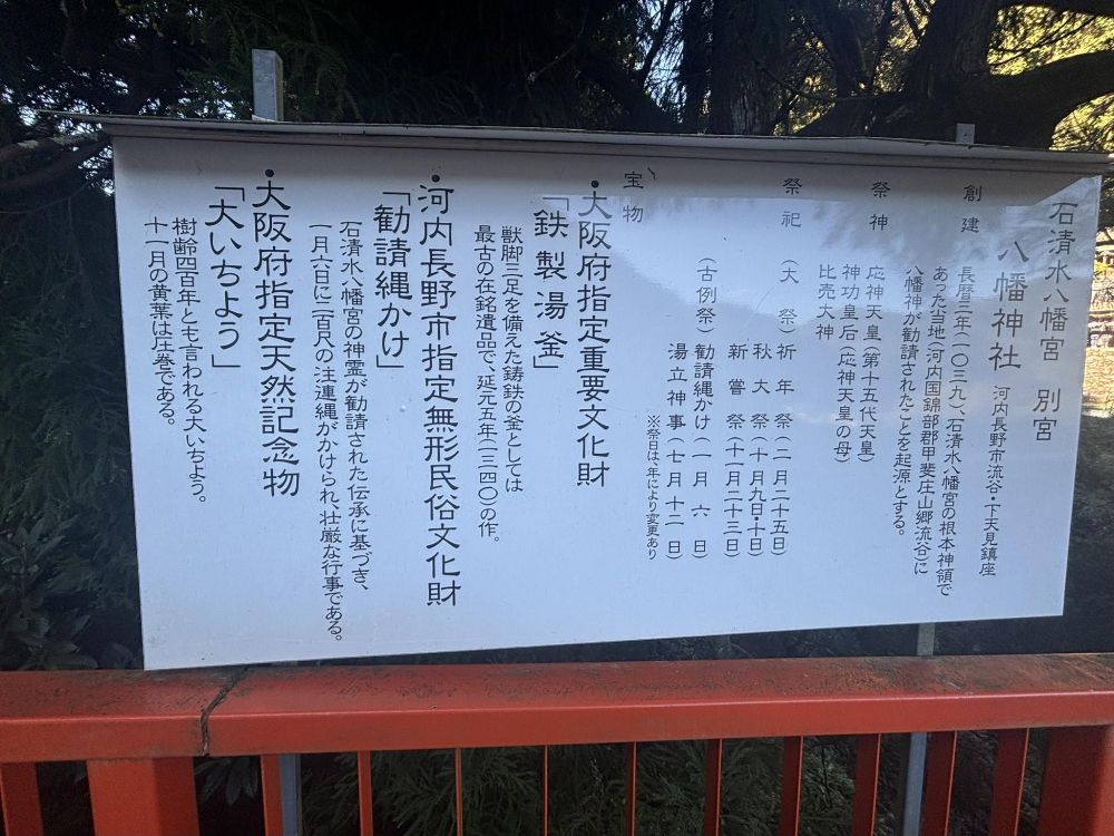 勧請縄かけのほか、鉄製湯釜や大イチョウなど、八幡神社に関する情報が紹介されています。