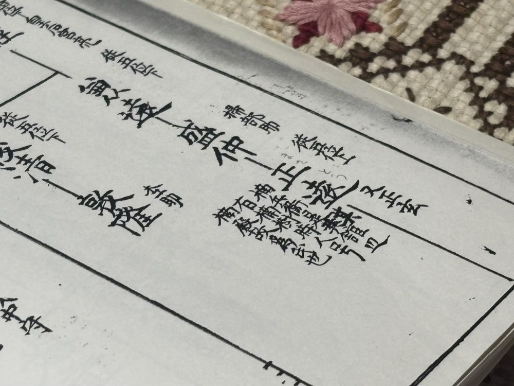 正成から系図を数枚めくると、正治という人物が出てきます。その下に甲斐荘(庄)の文字が見えます。正治は浜松で徳川家康に仕えたとのこと。