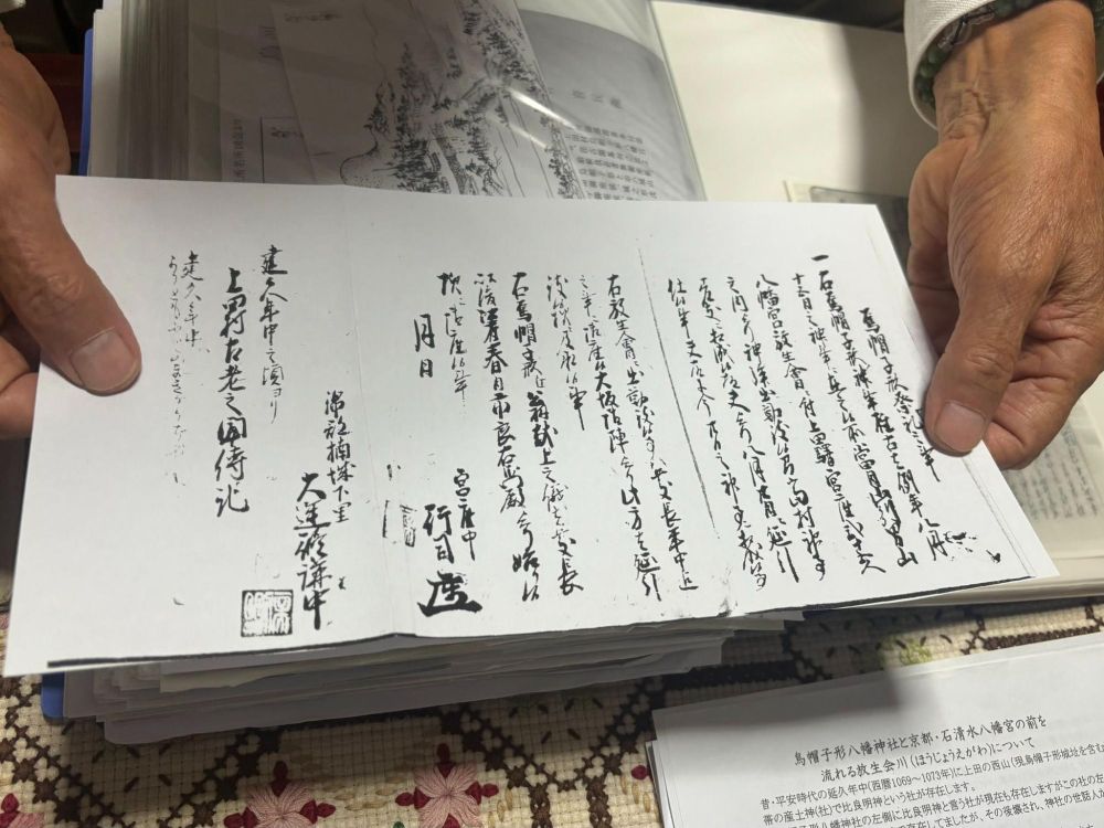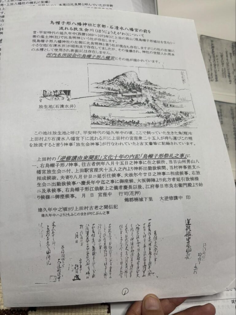 25人で生きた鯉を生きたまま放流したということで、「放流会神事」が行われたという記録が残されています。石清水八幡宮の神様とこの地域との往来は、東高野街道を経由しているのかなと想像しました。さらに現在の石清水八幡宮の「勅祭 石清水祭」(外部リンク)の元となったのではないかと推測されているそうなので、そう考えるとすごいですね。但し、専門家の見解によると中央の勅祭の方法が地方に伝播していくのが一般的な現象なので、「あくまで三日市で受け継がれている伝承ではないか」とのこと。