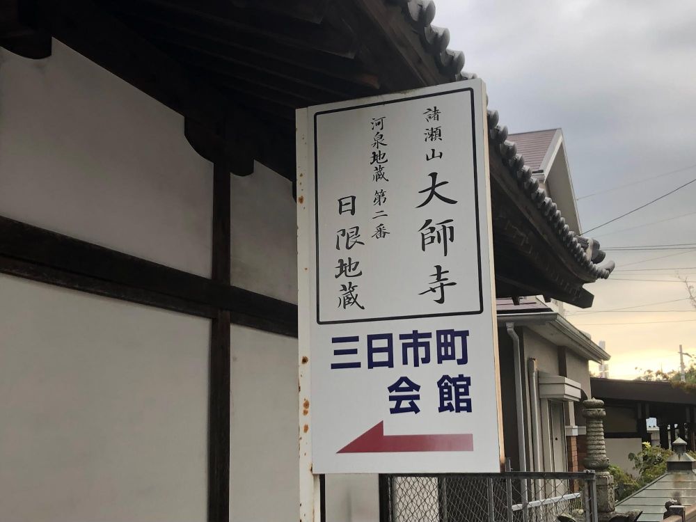 そして、三日市と名前が付く前は「諸瀬(もろせ)」と呼ばれていたそうです。ちょうど高野街道の石碑があるところ、石見川と天見川との合流地の北側に広がる低い場所をそのように呼んでいたそうで、その名残として三日市町駅前にある大師寺の山号が諸瀬山となっています。