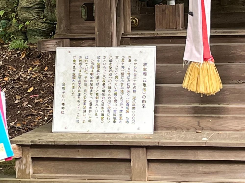 比良野社にある説明版によれば、延久年間(1070年)ごろに社の隣に池があったとのこと。池に住んでいた生きた魚を石清水八幡宮そばの川まで持っていき、そこに放流したというのです。