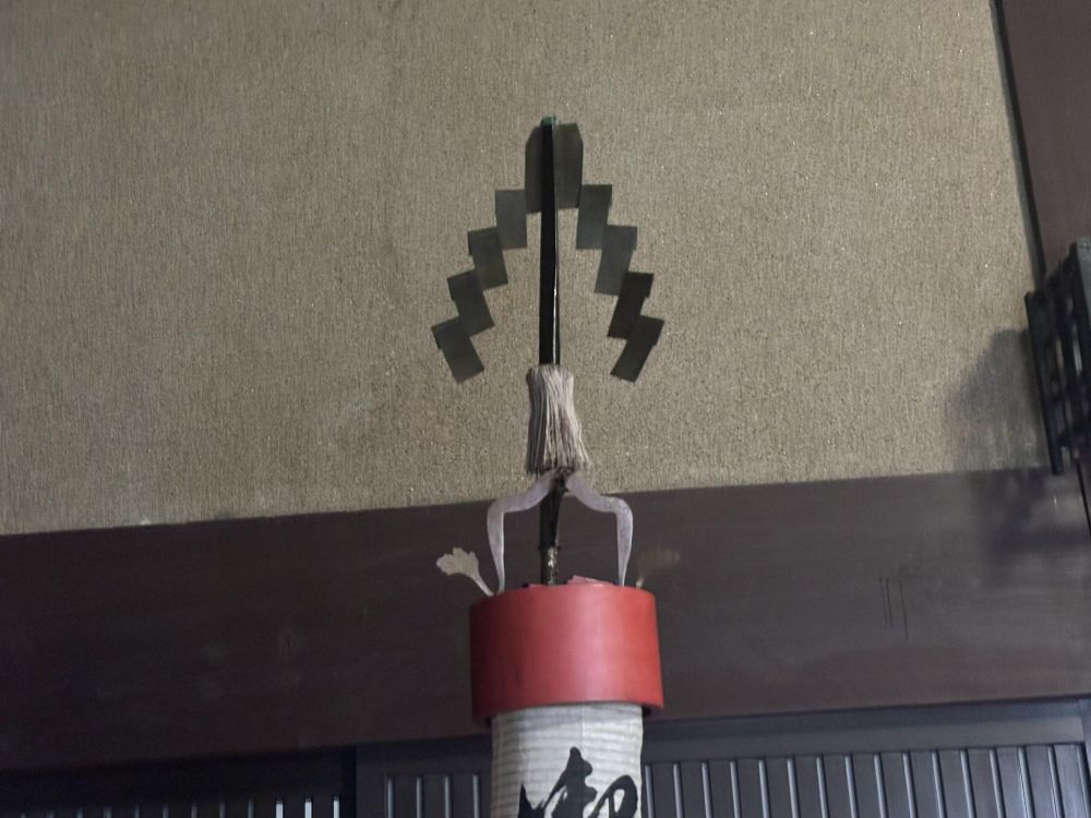 竹鼻さんが秋祭りに掲げる提灯は、天明年間のものといいます。当時は100の提灯があって参道に並んだそうです。これは明治から昭和の初めごろまで行われていました。しかし現在は行われておらず、竹鼻さんの家にひとつだけ残っていて、祭りの時に家の玄関の前に飾られています。