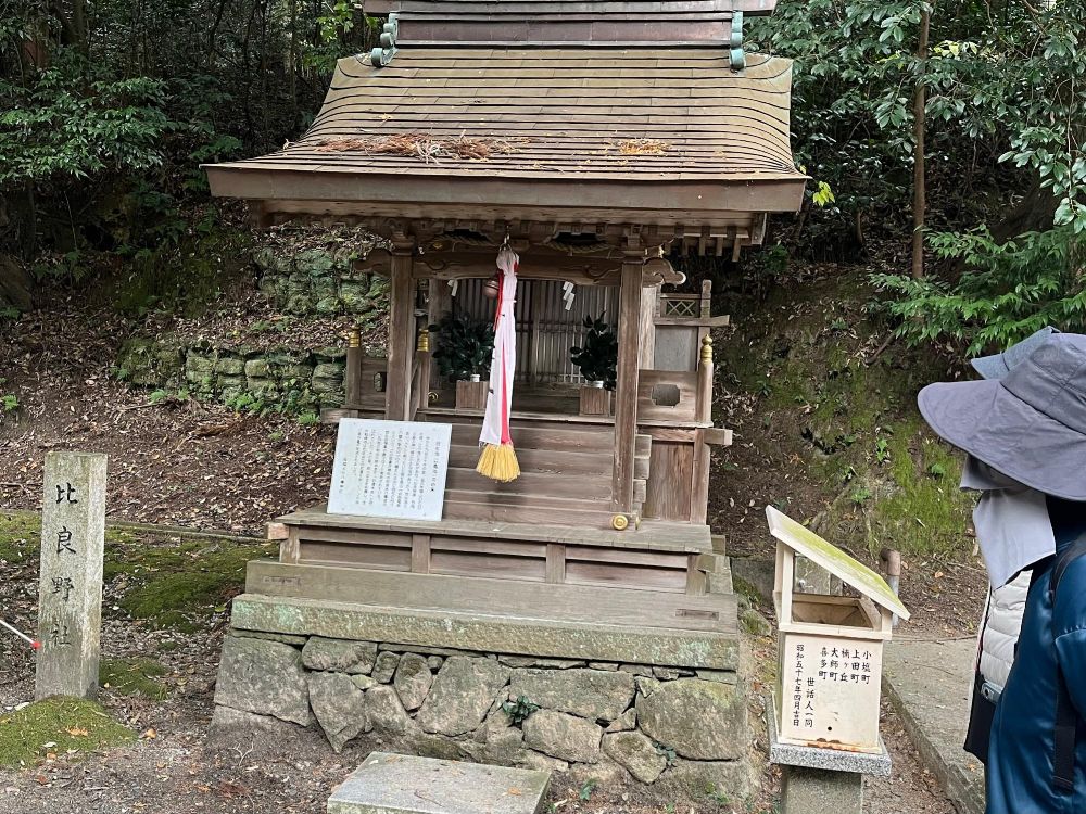 それについては、以前、烏帽子形八幡神社を河内長野ボランティアガイドさんに案内していただいた時に伺いました。境内にある比良野社の所にかつて池があったそうです。