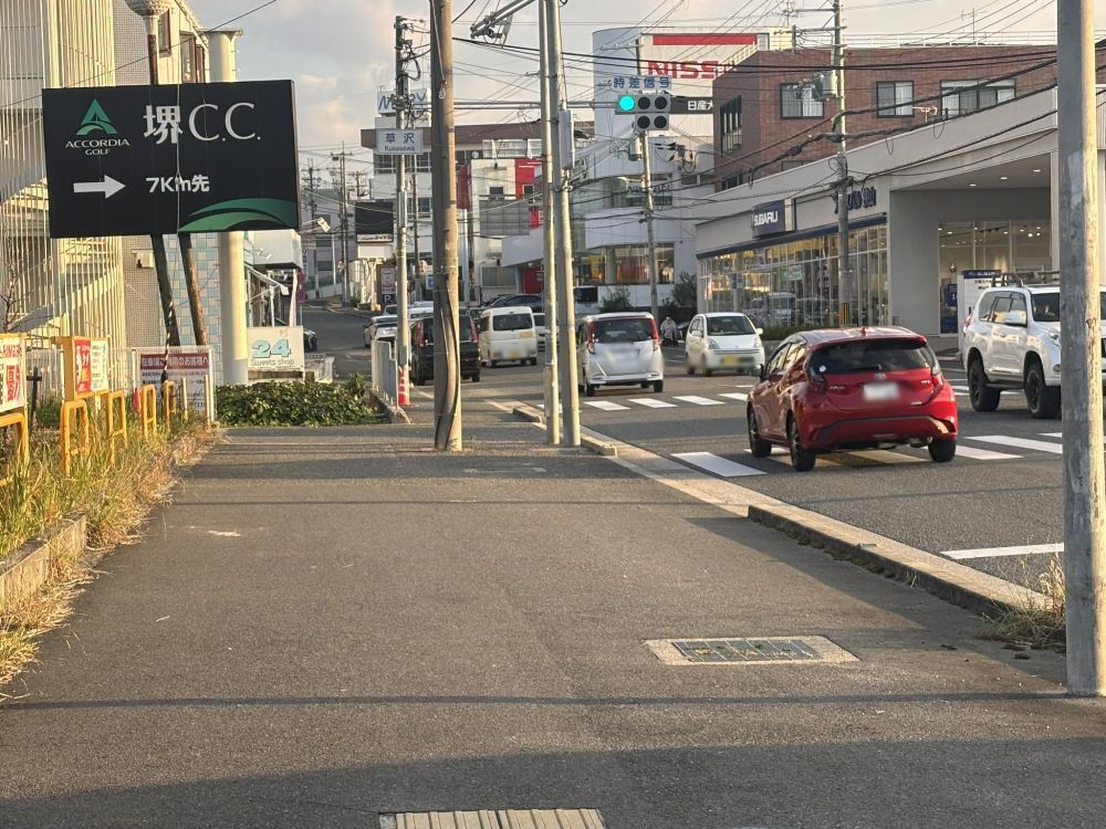 ここから西除川沿いに歩いていきましょう。画像の車の通りの多い道は、狭山池通り(大阪府道202号線)で、この通りに架けられた橋の名前は狭山池橋です。