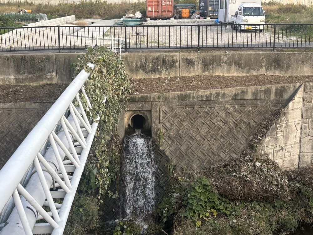 東茱萸木橋を越えると水管橋らしきものがあり、さらに排水構が見えて水が流れています。