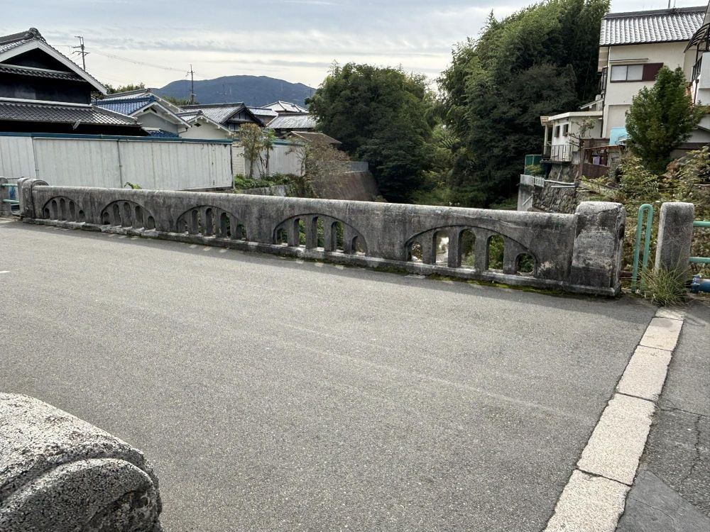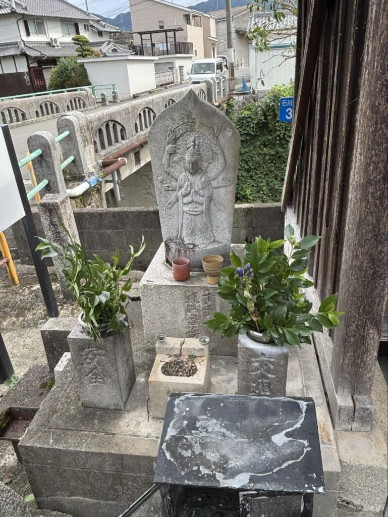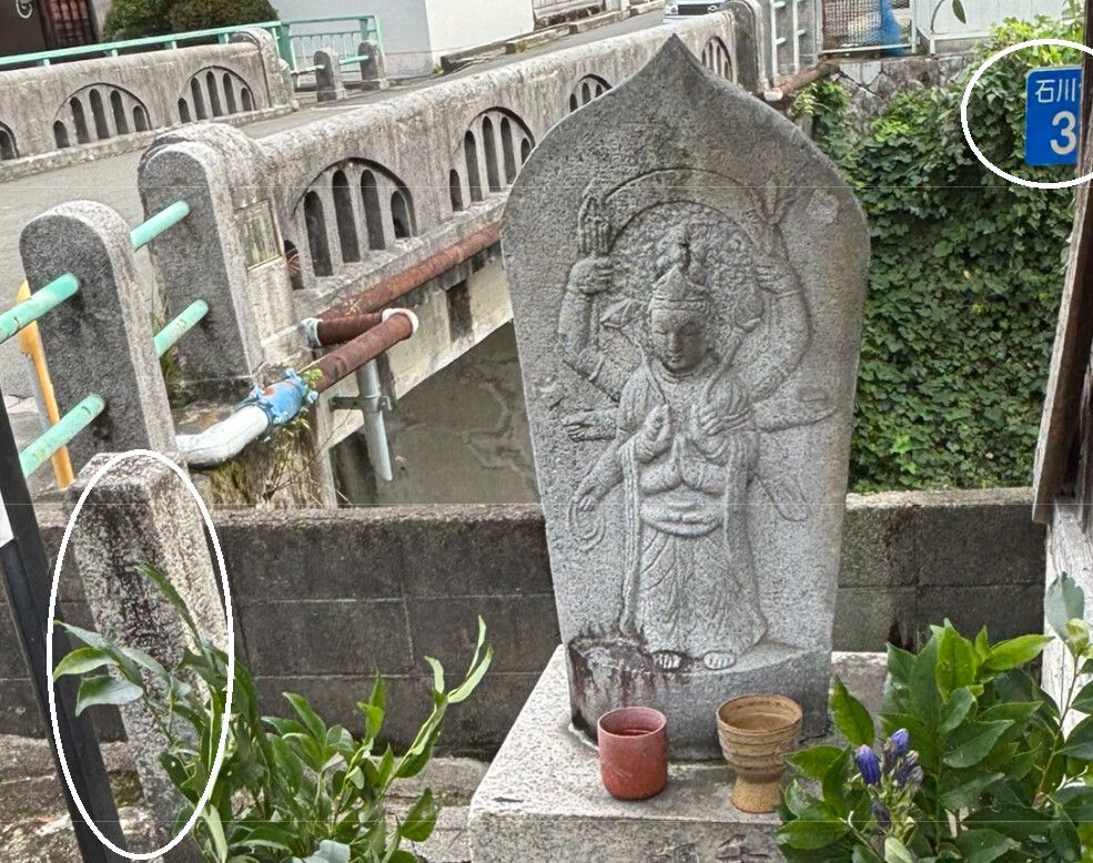 先ほどの千手観音菩薩像の周囲を見まわすと、背後に橋が架かっていて、千早川が流れています。そして古い「河川區域標」は左側の白丸で、右側の白丸が現在の「河川距離標」と考えられます。