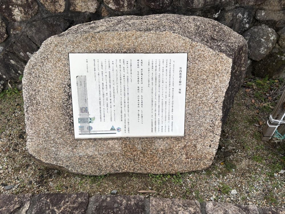 太子町にあるこの緑の一里塚は、実は太子町だけのものではなく、竹内街道のオリジナルなのだそうです。日本遺産竹内街道(外部リンク)のサイトによると、これは竹内街道にあった一里塚を整備したもので、2013年に竹内街道・横大路が敷設1400年を記念して設置されたものです。太子町のほかには大阪市、堺市、松原市、羽曳野市、葛城市、大和高田市、橿原市の街道沿いに設置されました。