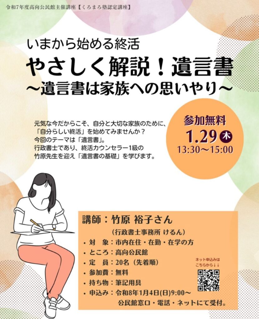高向公民館では令和7年度主催講座「くろまろ塾認定講座」としていまから始める終活というテーマで「やさしく解説!遺言書」遺言書は家族への思いやり口座を1月29日13:30~15:00まで開催します。元気なうちに自分らしい終活を始めましょう。