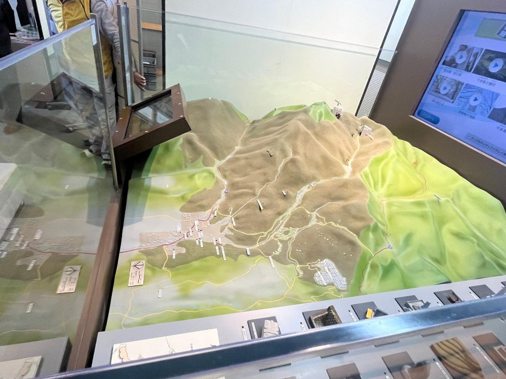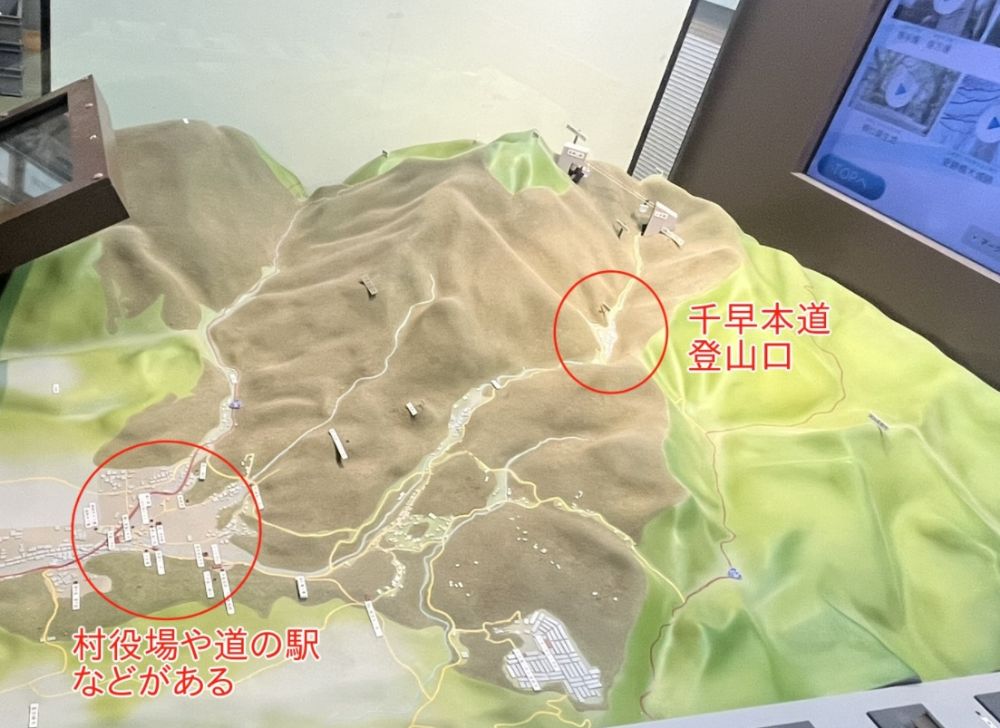 私が村に行くときに多く立ち寄る場所といえば村役場や道の駅、くすのきホールなどがあるエリアか、千早本道の登山口があるエリアです。ジオラマを見るとこの両者には明らかな高低差の違いがあり、両者を一本の道が谷沿いに続いているのがわかります。