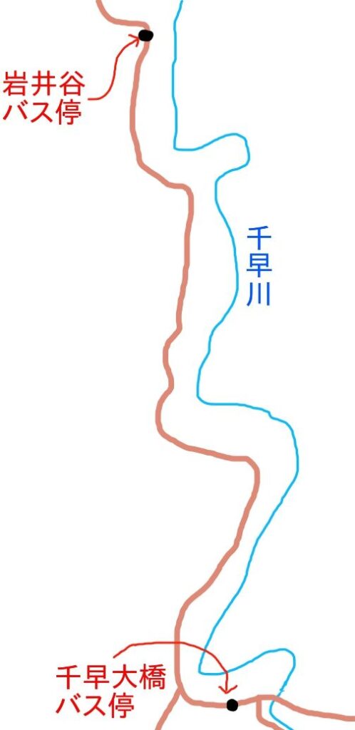 千早大橋バス停から岩井谷バス停までの道のり