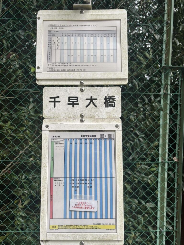 千早大橋バス停です。南海バスと旧金剛バスをひきついだ金剛ふるさとバスのバス停です。