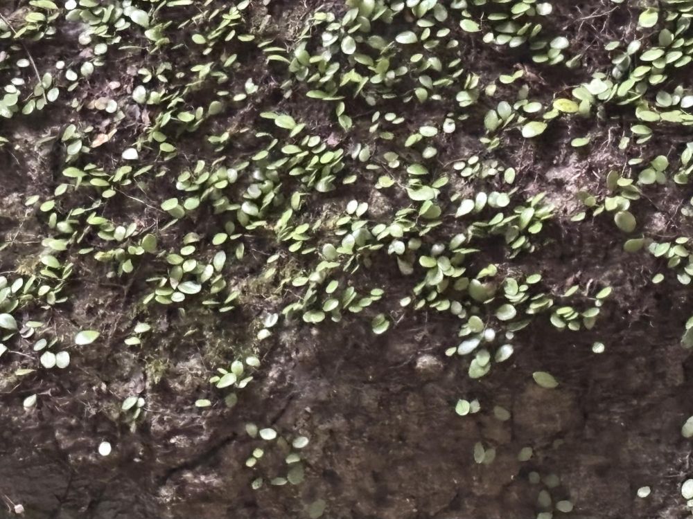 岩にくっついているものを拡大しました。調べるとシダ植物の前葉体(ぜんようたい)の可能性が高いようです。前葉体とはシダ植物が出す胞子から出来るもので、裏側に卵と精子に該当するものが作られます。やがて受精し、「シダ」として目にする「胞子体(ほうしたい)」が成長していきます。すると役目を終えた前葉体は枯れるそうです。