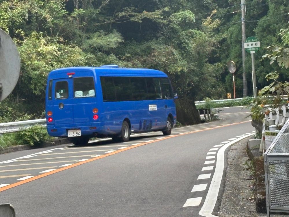 バスが通過している横に岩井谷バス停が見えました。