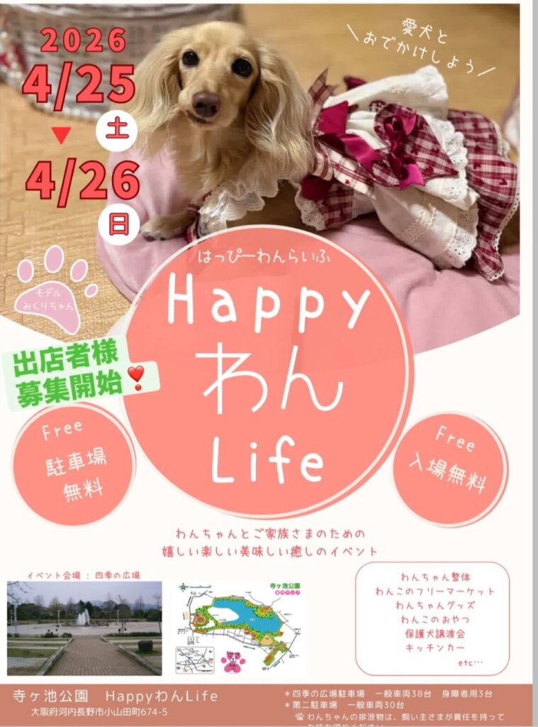 寺ヶ池公園でわんちゃんと飼い主様が楽しく癒される1日を企画したイベントが4月25、26日の2日間、10:00〜16:00まで行われることが決まり、現在出店者を募集しています。記念すべき屋外での初イベント主催です。