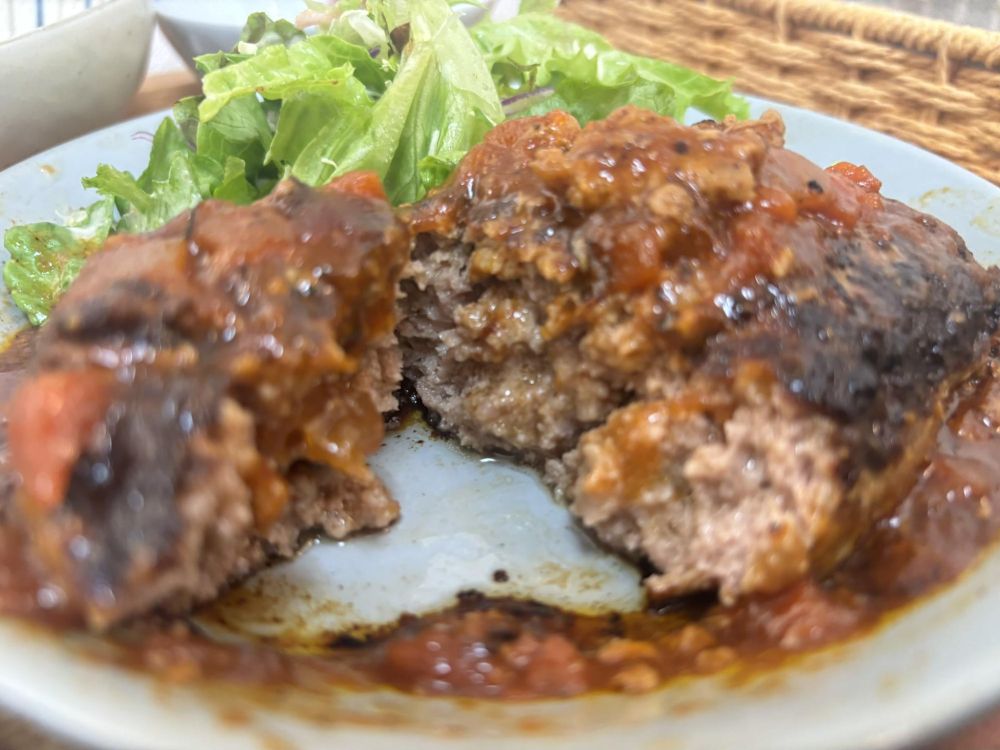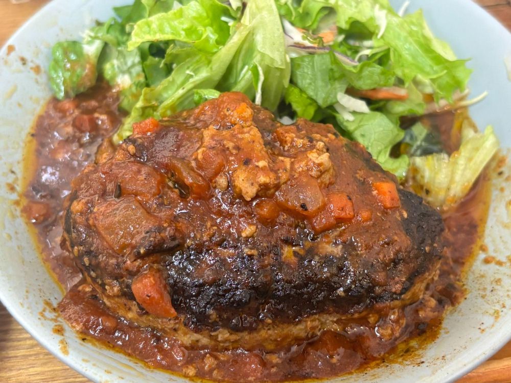 こちらがメインのハンバーグです。しっかりとソースがかけられていて、ソースの海の中にハンバーグという島が浮いているかのようです。