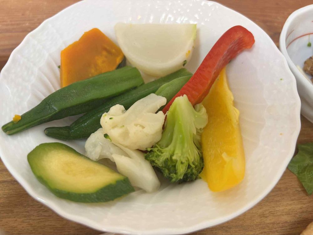 キッチンハートさんの公式ページを見ると、シャープの過熱水蒸気オーブンレンジ「ヘルシオ」で料理されているそうです。これは蒸し野菜の皿ですが、野菜のカットの仕方が大きくて、食べ応えがあります。ポン酢だれで食べました。