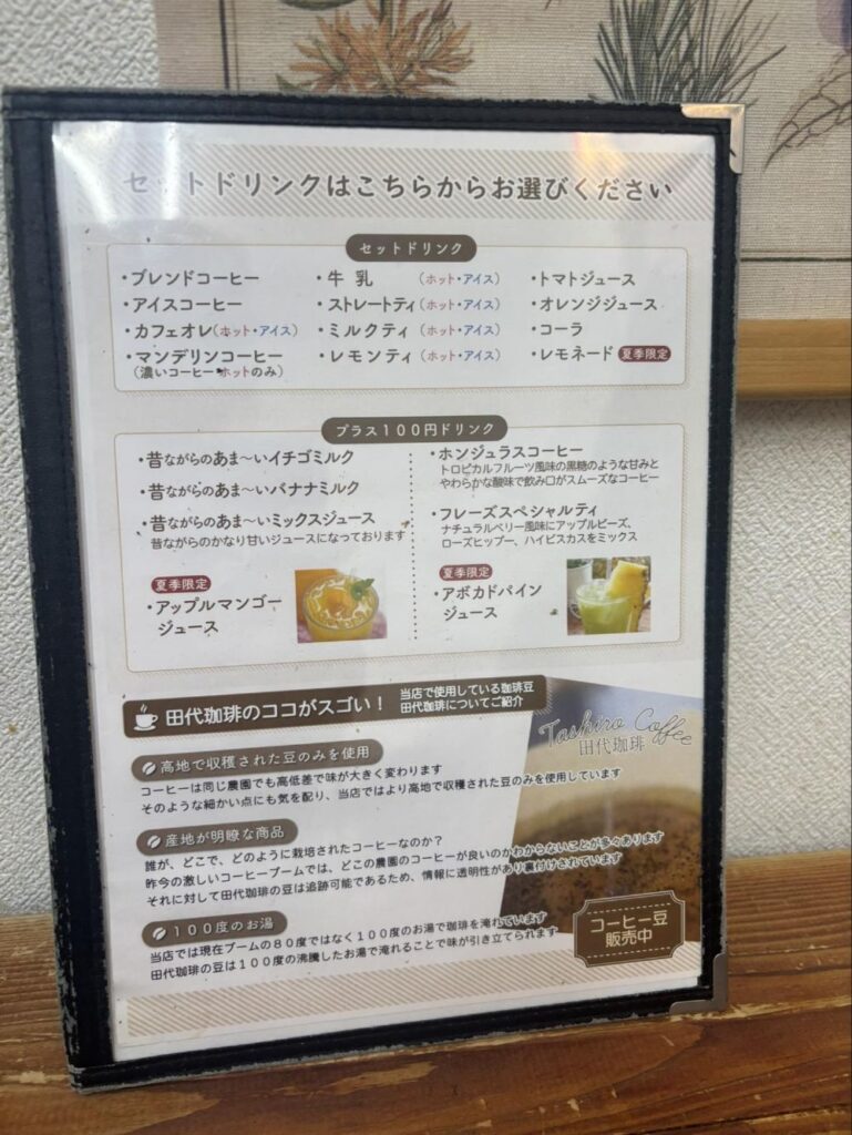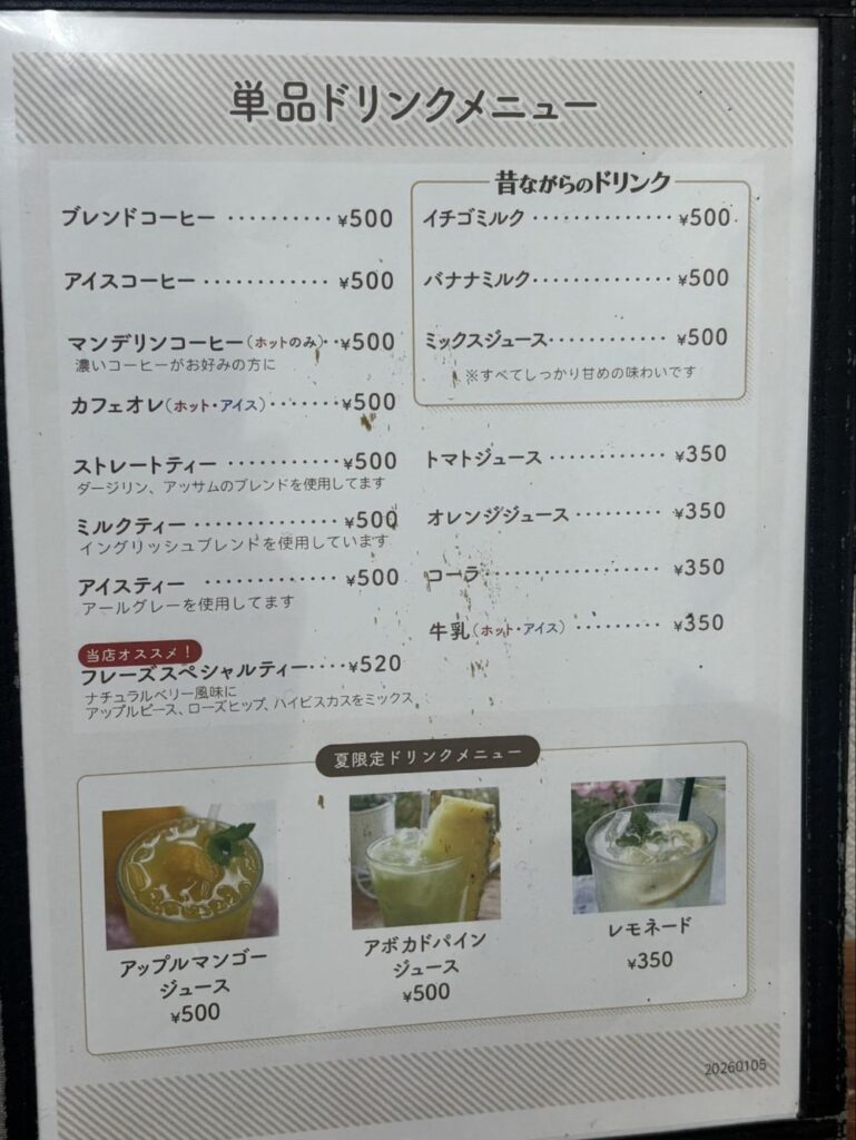 今回は別の用事があったので注文していませんが、ドリンクもこだわりがあります。定番のコーヒーや紅茶のほか、昔ながらの甘いジュース、また今は季節外れですが、夏限定のドリンクも美味しそうですね。