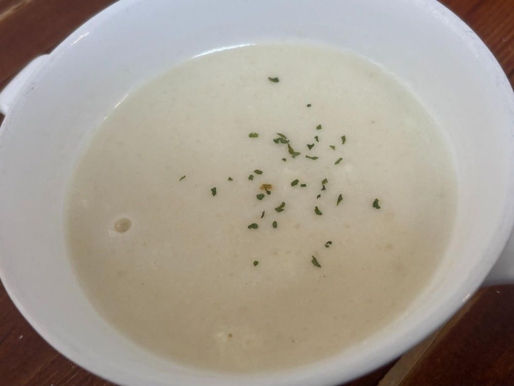 スープが来ました。そして温かいうちに頂きましたが、「これは美味い」と感じました。出来合いものではなくしっかりと野菜をすりつぶしてスープにしているのがわかり、中に完全につぶれていない野菜の粒が入っています。そんなナチュラルな美味さで期待が持てます。
