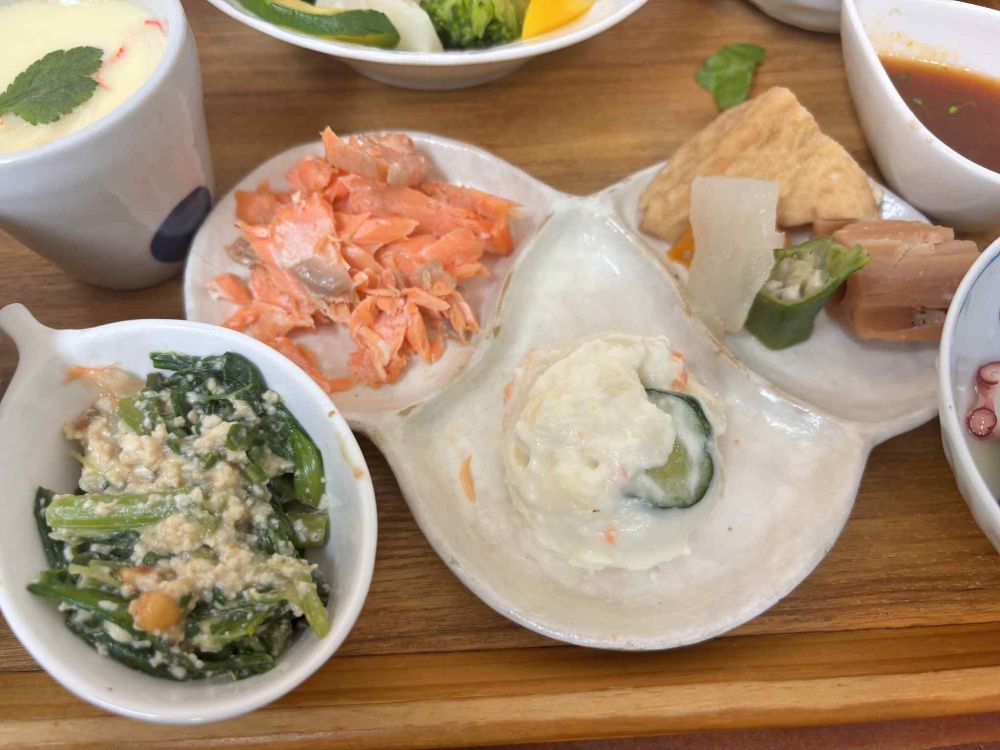 もう1品はお惣菜セット(1500円)です。こちらはメインがない代わりに、9品もあり、いろんなおかずを食べたい人には最適です。特に真ん中の鮭の身をほぐした逸品、量もたっぷりあって、ふりかけ代わりにとご飯との相性がばっちりでした。