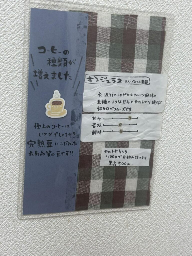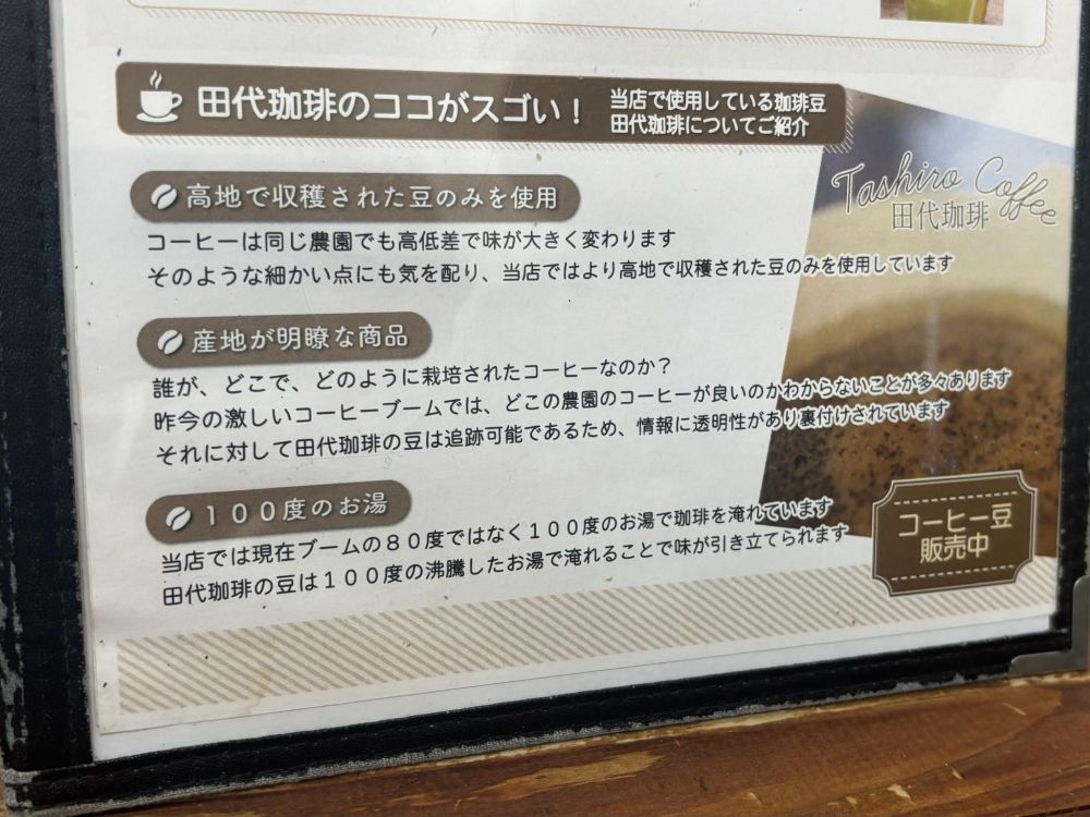 そしてコーヒーにもこだわりがあります。昭和8年に創業した田代兄弟商会を源流に持つ東大阪の田代珈琲(外部リンク)を使っているとのこと。高地で栽培した豆のみを使い、産地が明瞭で、現在の80度ではなく沸騰温度の100度で淹れると味が引き立てられるそうです。