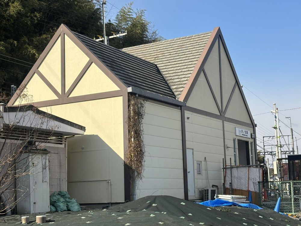 そのため汐ノ宮駅のホームの西側(画像から見て左側)は崖になっていて、坂道を上る必要があります。通常汐ノ宮駅に行く場合は、画像の富田林方面からの踏切を通って駅に行きます。