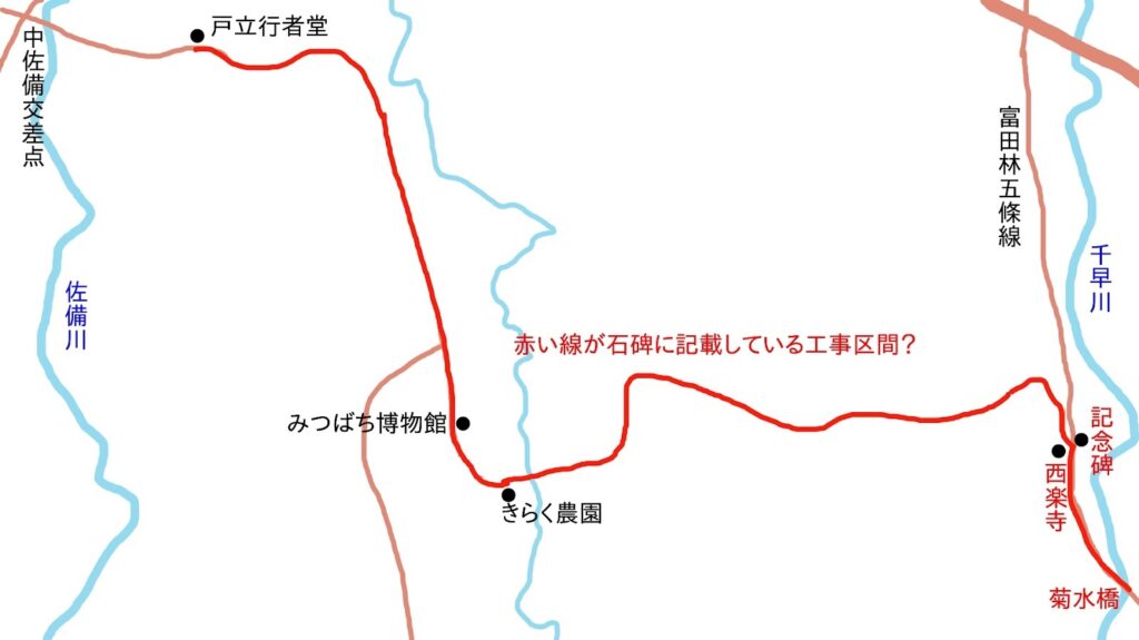 石碑には、中佐備行者堂前と森屋菊水橋の間の工事に関することと明記されています。恐らく上の画像の赤い線の部分に関するものと想像されます。