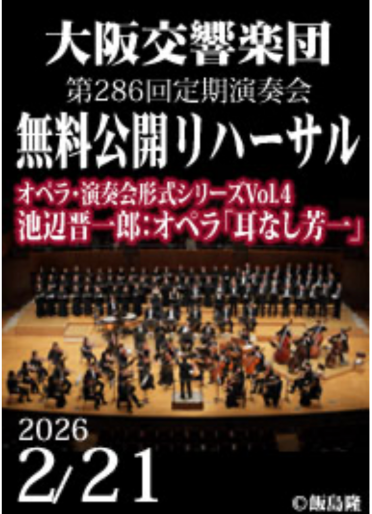 大阪交響楽団の無料公開リハーサルがライブリーホールで2月21日に行われます。今回はオペラ・演奏会形式シリーズVOL.4 池辺晉一郎:オペラ「耳なし芳一」が行われます。