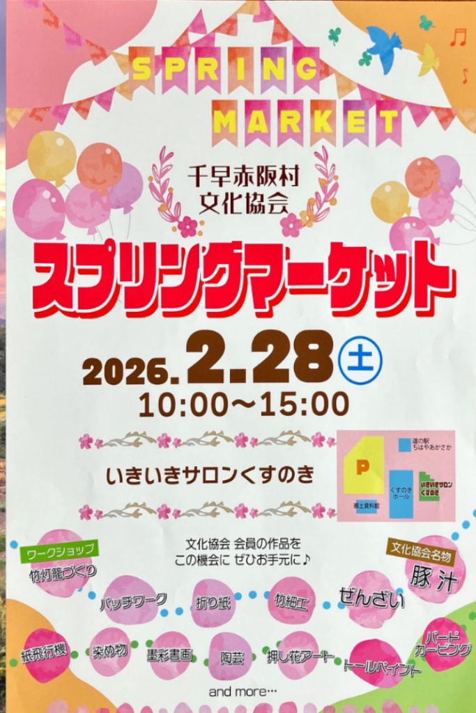道の駅ちはやあかさかやくすのきホール、郷土資料館に隣接したところにあるいきいきサロンくすのきで、2月28日に文化協会会員の作品がお手元に見られるスプリングマーケットが開催されます。時間は10:00から15:00までです。