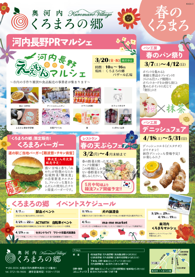 道の駅奥河内くろまろの郷では3月と4月の予定が発表になりました。春の天ぷらフェア(3月2日~4月末)春のパン祭り(3月7日~4月12日)、河内長野PRマルシェ(3月20日9 デニッシュフェア(4月18~5月31日)などの開催が決まっており、そして数量限定でくろまろバーガー(難波葱&チキン南蛮)の販売があります。さらにレストランでは5月中旬ごろより韓流フェア開催を予定。